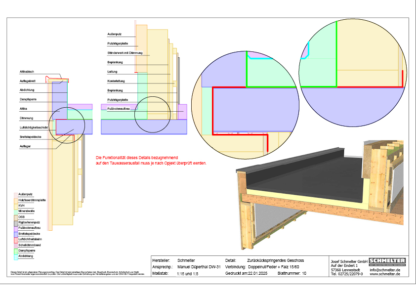 Die Holzbaukonstruktion ist die typische Bauart für Dächer. Allerdings ist der traditionelle Materialübergang vom Mauerwerk zum Holzbau an der Dachkante denkbar ungünstig. Die bautechnischen Anforderungen, die aus diesem Materialwechsel entstehen, sind viel einfacher, rationeller und kostengünstiger an der Geschossdecke zu realisieren.