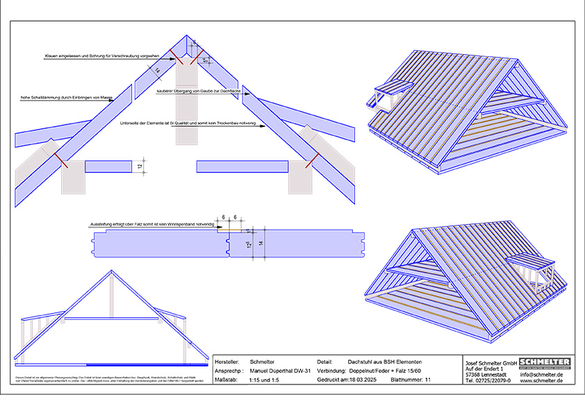 Durch die eingesetzte Technik in den Holzbaubetrieben (CAM) ist es sehr einfach, die schrägen Formen des Dachgeschosses herzustellen. Abbundanlagen realisieren den Zuschnitt der Holzkonstruktion vollautomatisch.